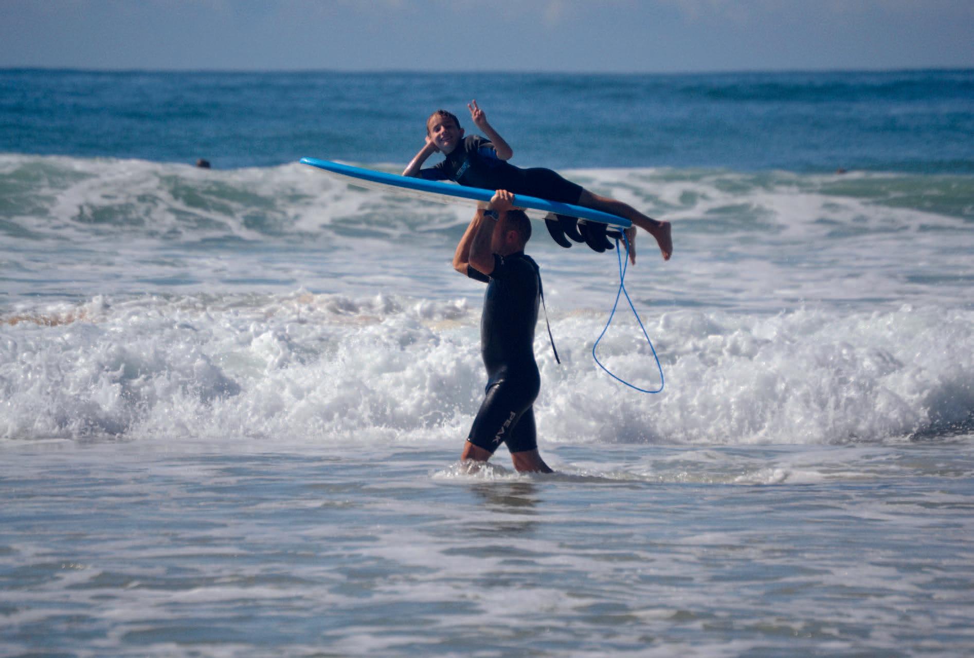 Roger carrying his son Manuel on a surfboard in 2013